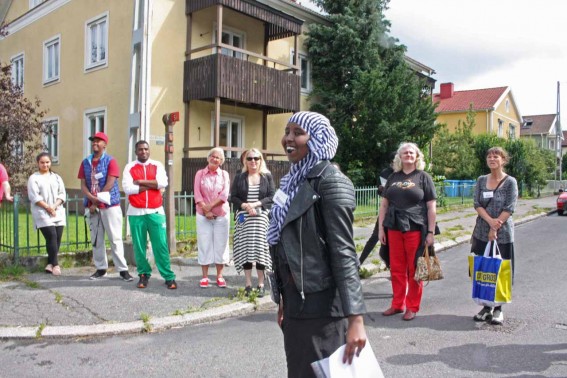 Stadsvandringen lägger ett pussel, bit fogas till bit. Till slut har publiken fått veta en hel del om gårdar, bostäder, arbetsplatser och kändisar (Markus Krunegård är en) som alla har anknytning till området. Eva Lundgren Stenbom har fullt sjå med att plocka fram och sedan ta hand om de stora fotografier som de unga guiderna visar upp för åhörarna.