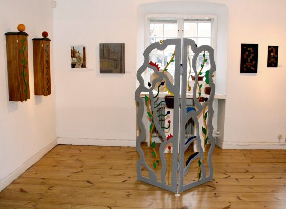 Två skärmar (?) med slingrande växtlighet i klara färger tar plats i Galleri Rådhuset. Lars Malms fantasi bevarar sommaren. Annars visar han nya skåp, några vars dekorationer anspelar på samma växtglädje, andra med stramare linjeföring. Och fortfarande har han pippi i skallen, det började redan i somras…